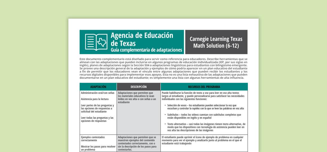 Se provee una descripción general de la adaptación y ejemplos de cómo podría aparecer en un plan educativo del estudiante a fin de permitir que los educadores vean el vínculo entre algunas adaptaciones que pueden recibir los estudiantes y los recursos digitales disponibles para implementar esos apoyos. Esta no es una lista exhaustiva de las adaptaciones que pueden documentarse en un plan educativo del estudiante; es simplemente una lista con algunas herramientas de alta influencia.