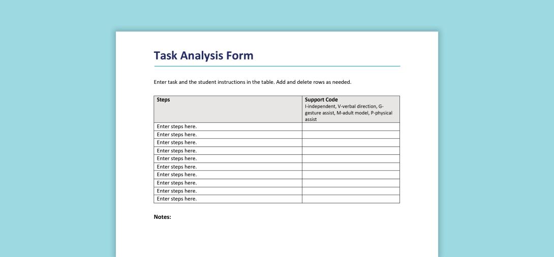 Task analysis is the process of breaking down a task, skill, or process into smaller steps. An educator identifies which steps a student can complete independently, then investigates what supports the student may need to learn the other steps while working towards mastery.