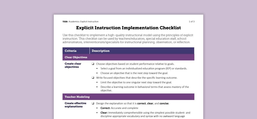 This checklist can be used for instructional planning, observing, or reflecting on the implementation of explicit instruction. It can be used by teachers, administrators, or instructional coaches and was designed to accompany the “Explicit Instruction” pathway (training). It is recommended that training is completed prior to using this tool. There are two options to complete this training. Find and contact a regional MTSS specialist to enroll in a synchronous course, or enroll for an asynchronous course.