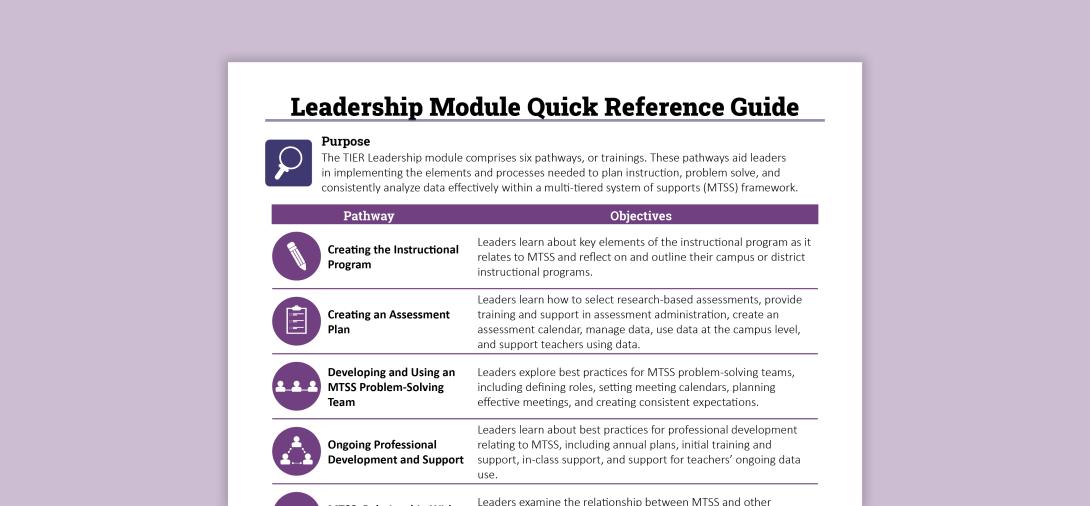 The TIER Leadership module comprises six pathways, or trainings. These pathways aid leaders in implementing the elements and processes needed to plan instruction, problem solve, and consistently analyze data effectively within a multi-tiered system of supports (MTSS) framework