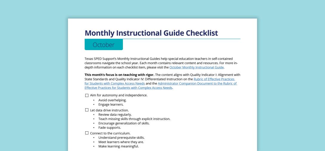 Texas SPED Support’s Monthly Instructional Guides help special education teachers in self-contained classrooms navigate the school year. Each month contains relevant content and resources.