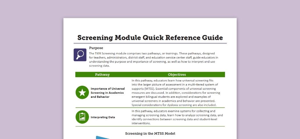 The TIER Screening module comprises 2 pathways, or trainings. These pathways, designed for teachers, administrators, district staff, and education service center staff, guide educators in understanding the purpose and importance of screening, as well as how to interpret and use screening data.