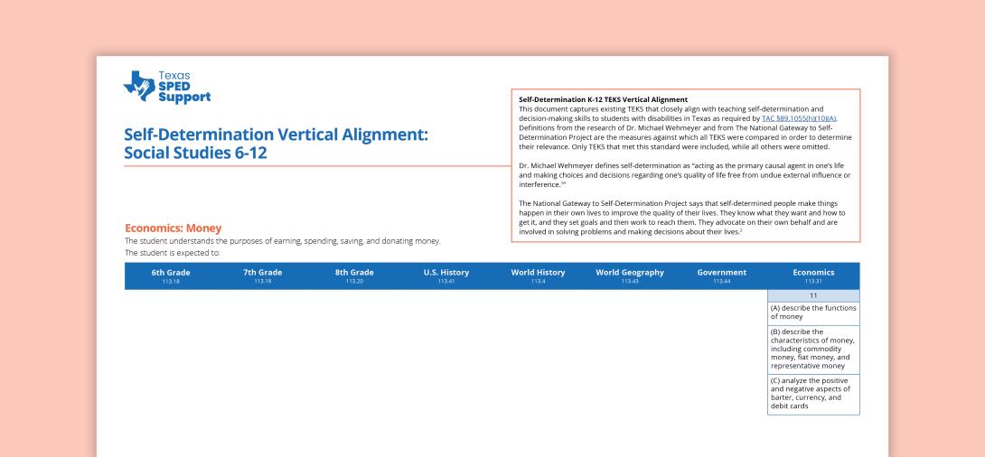 Educators may use this document to consider where self-determination skills are addressed in social studies TEKS for middle and high school or to develop standards-based annual individualized education program (IEP) goals for a specific student.